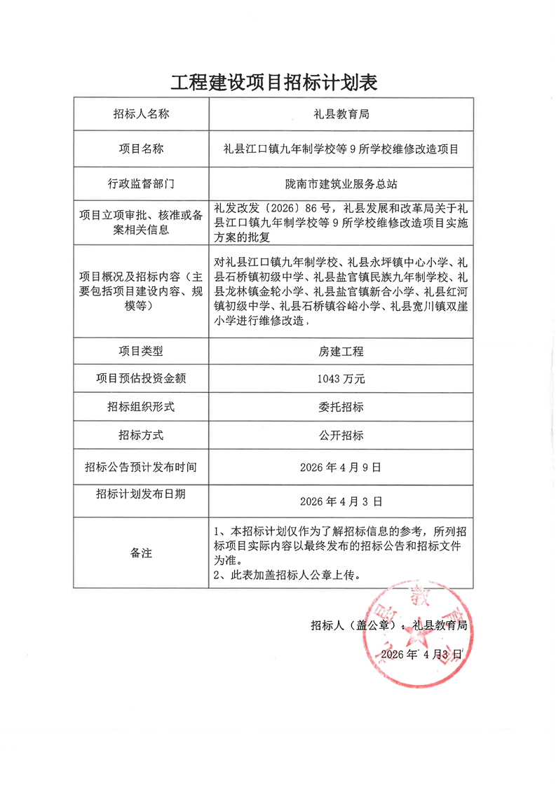 禮縣江口鎮(zhèn)九年制學(xué)校等9所學(xué)校維修改造項目
