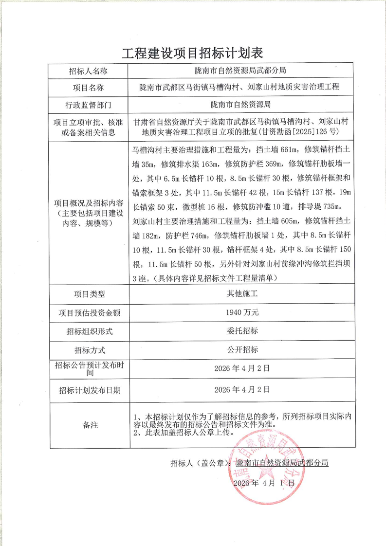 隴南市武都區(qū)馬街鎮(zhèn)馬槽溝村、劉家山村地質(zhì)災(zāi)害治理工程